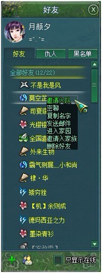 按F5打开好友面板,可以查看好友的在线状态,还可以进行组队、聊天、查看心情语言、亲密度、好友信息等各种操作。