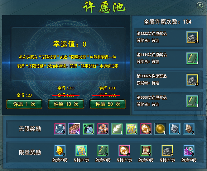 双十一期间许愿池活动限时开放!只需少额金币即可获得大量高价值的珍稀道具,更有机会获得绝世豪礼!心动不如行动,赶快来参与吧!