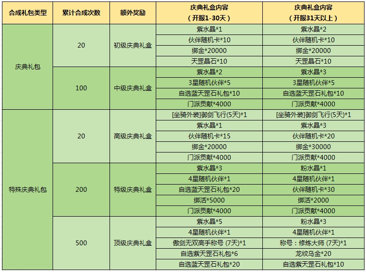 5. 累计合成礼包达特定次数可额外获取[内测庆典礼盒],开启后可获得紫~粉水晶、3~4星伙伴随机卡、自选蓝~紫色天罡石、门派贡献、活力等珍稀奖励: