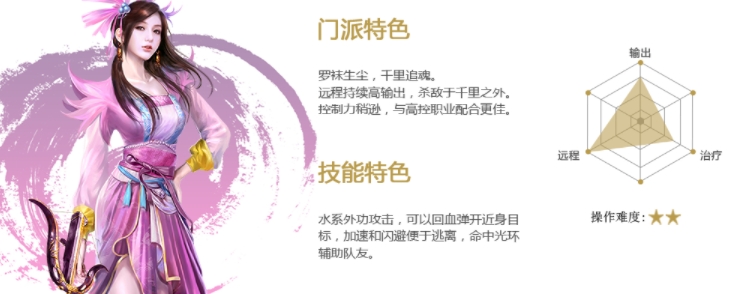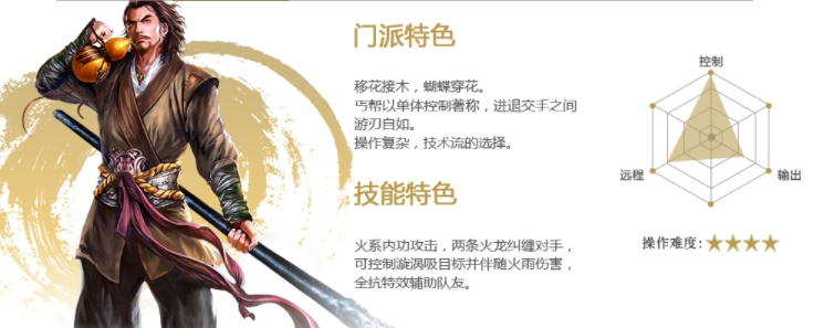移花接木,蝴蝶穿花。丐帮以单体控制著称,进退交手之间游刃自如。操作复杂,技术流的选择。