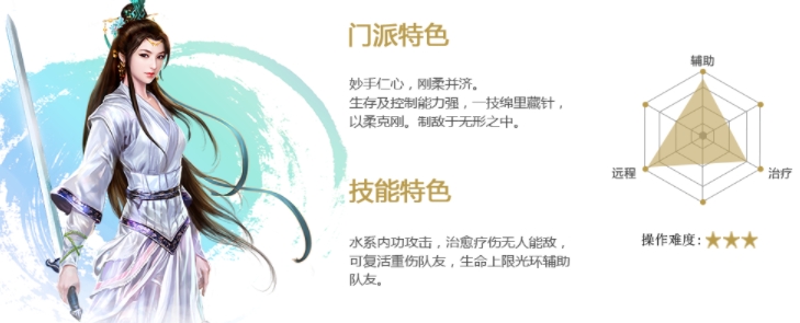 水系内功攻击。治愈疗伤无人能敌,可复活重伤队友,生命上限光环辅助队友。