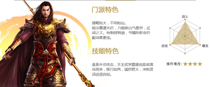 金系外功攻击,天王武学直接由实战演化而来,疾行如风,猛烈若火,冲刺灵活进退自如。